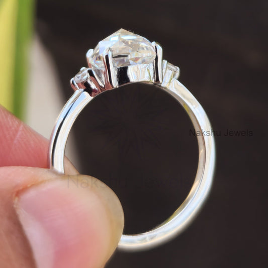 Round Rose Cut Moissanite Engagement Ring, Three Stone Design