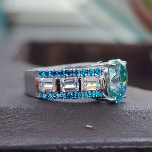 Cyan Blue Oval & Emerald Cut Moissanite Pave Engagement Ring