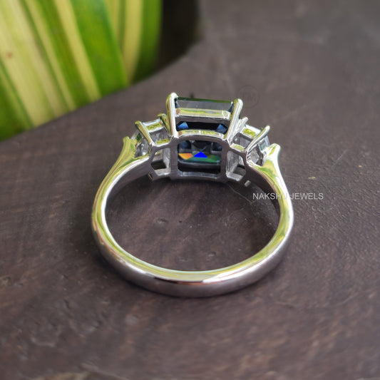 Blue Asscher Cut Moissanite With Side Cadillac 3 Stone Engagement Ring