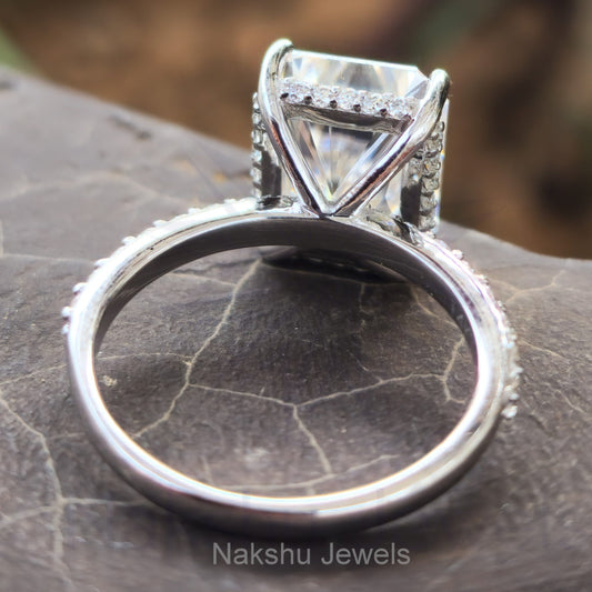 Emerald Cut Moissanite Hidden Halo Pave Set Engagement Ring
