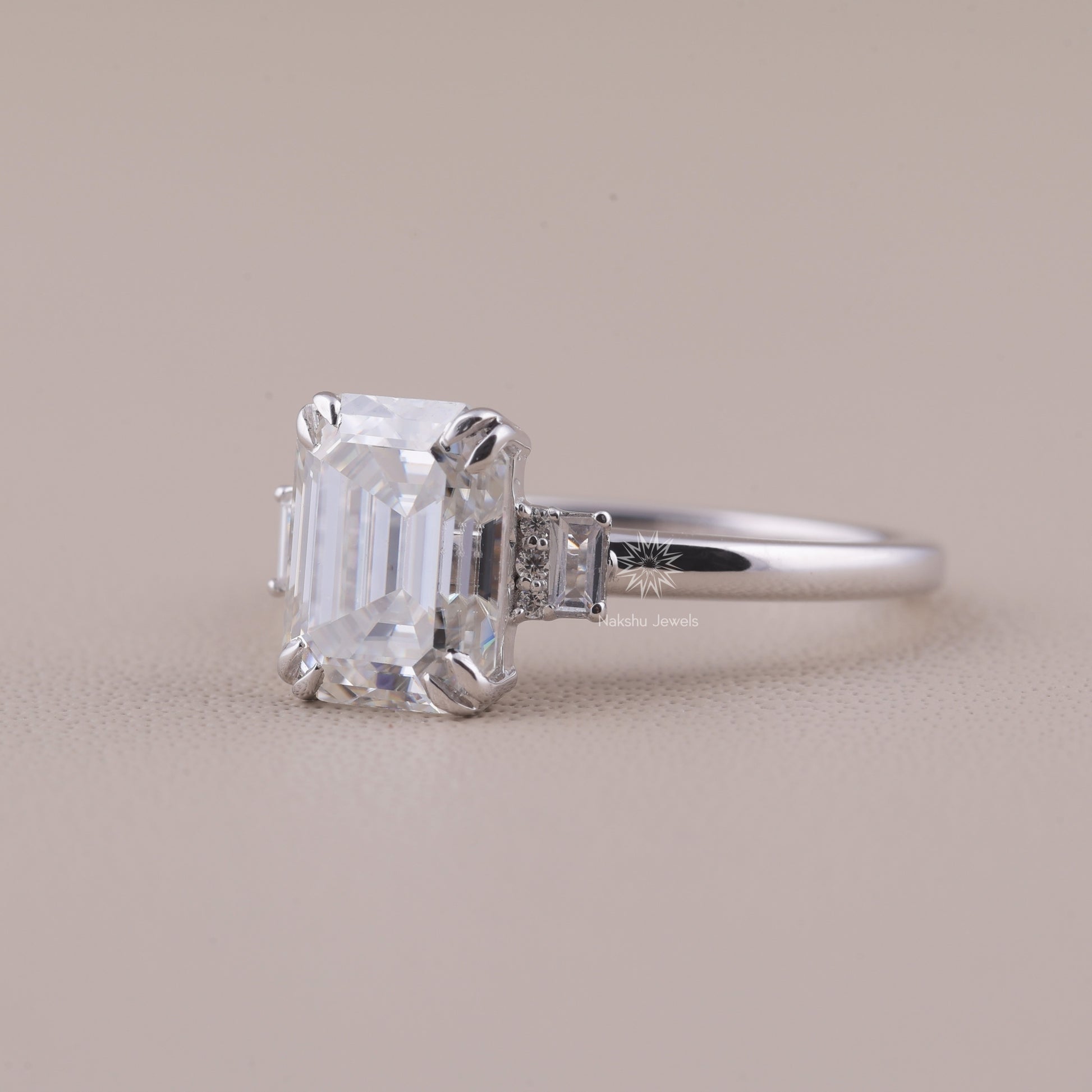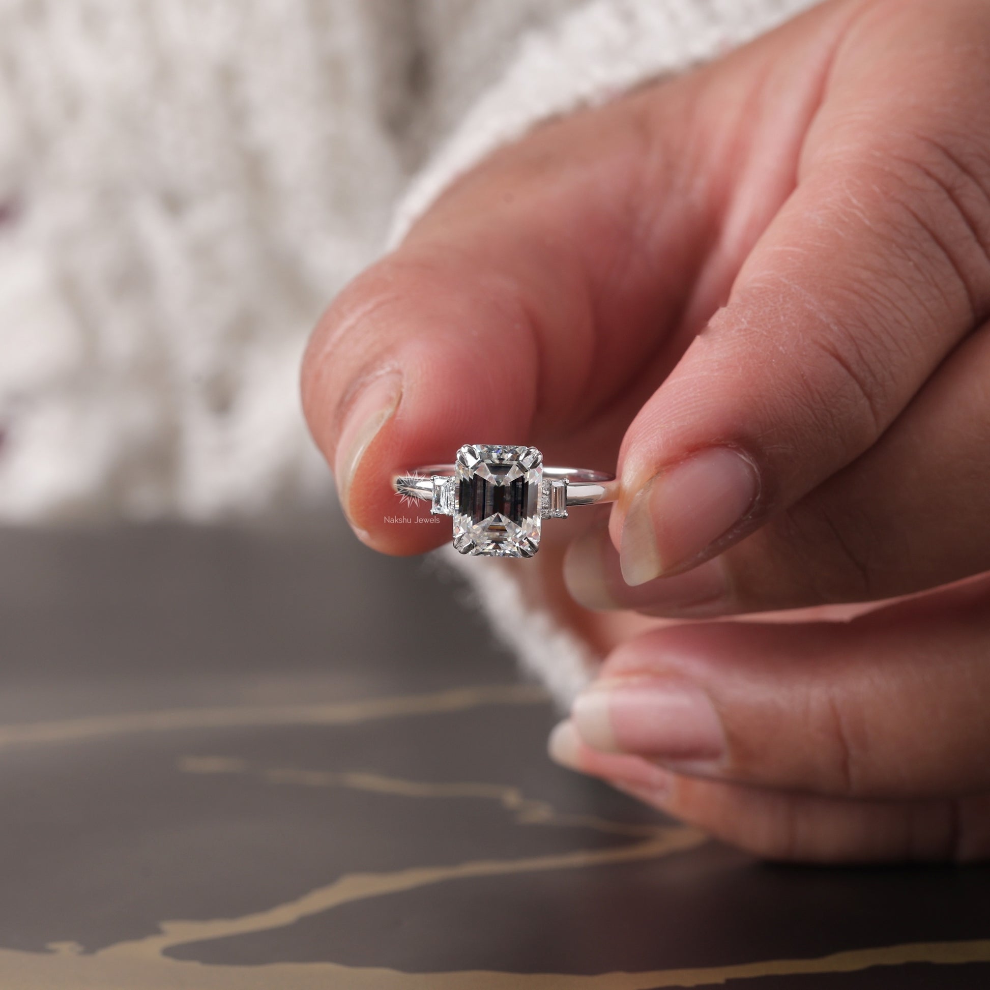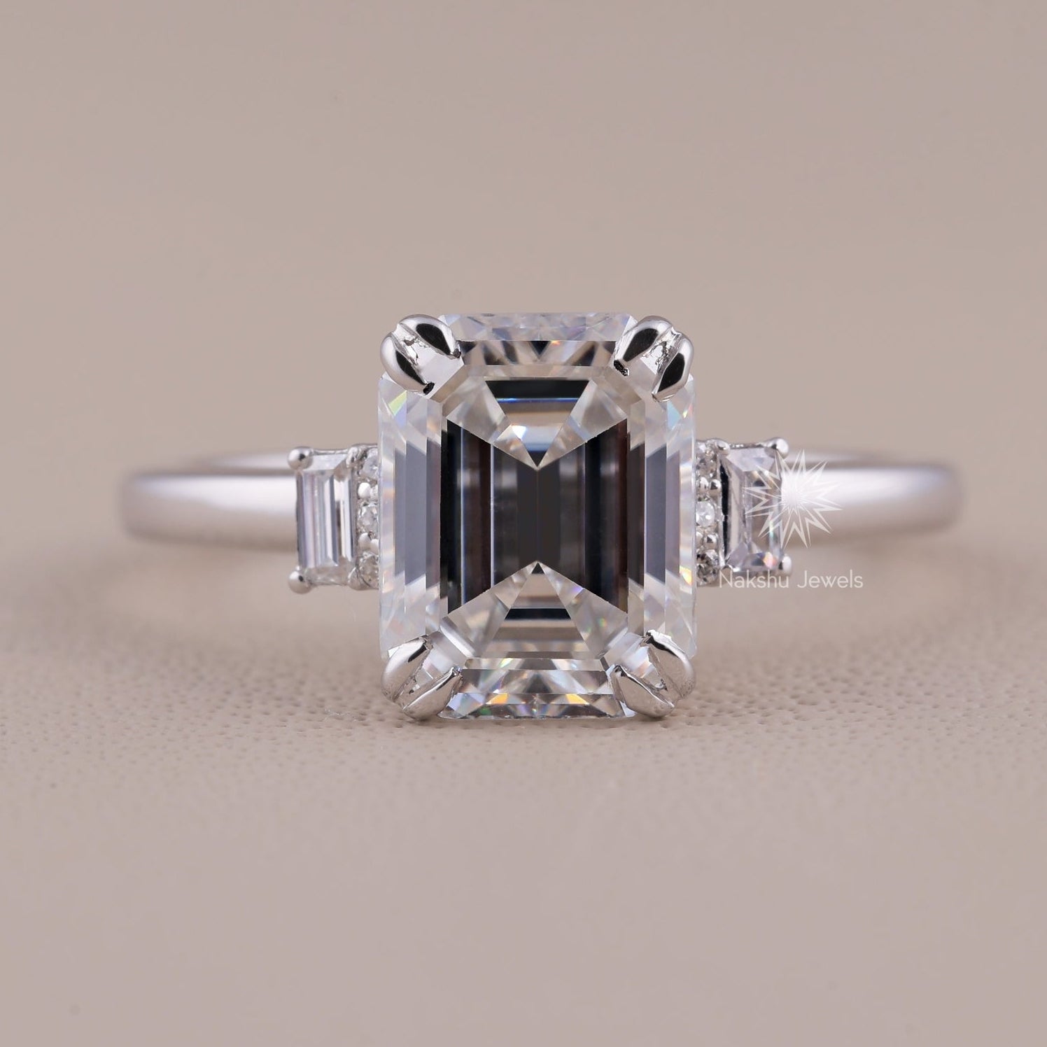 Emerald Cut Moissanite Three Stone Engagement Ring, 14K Gold 3 Stone Wedding Ring For Women