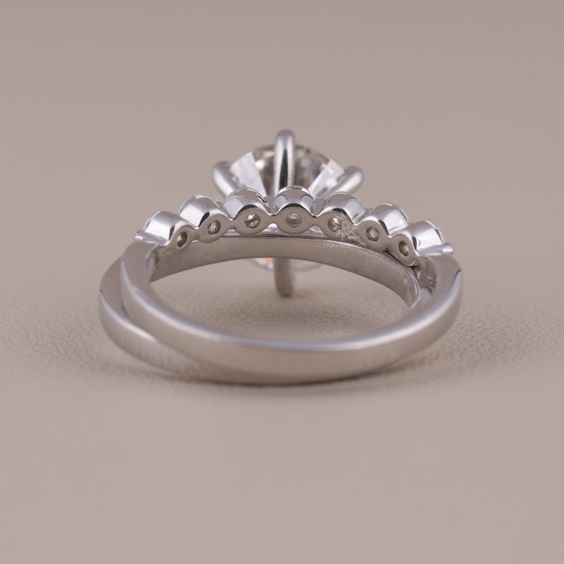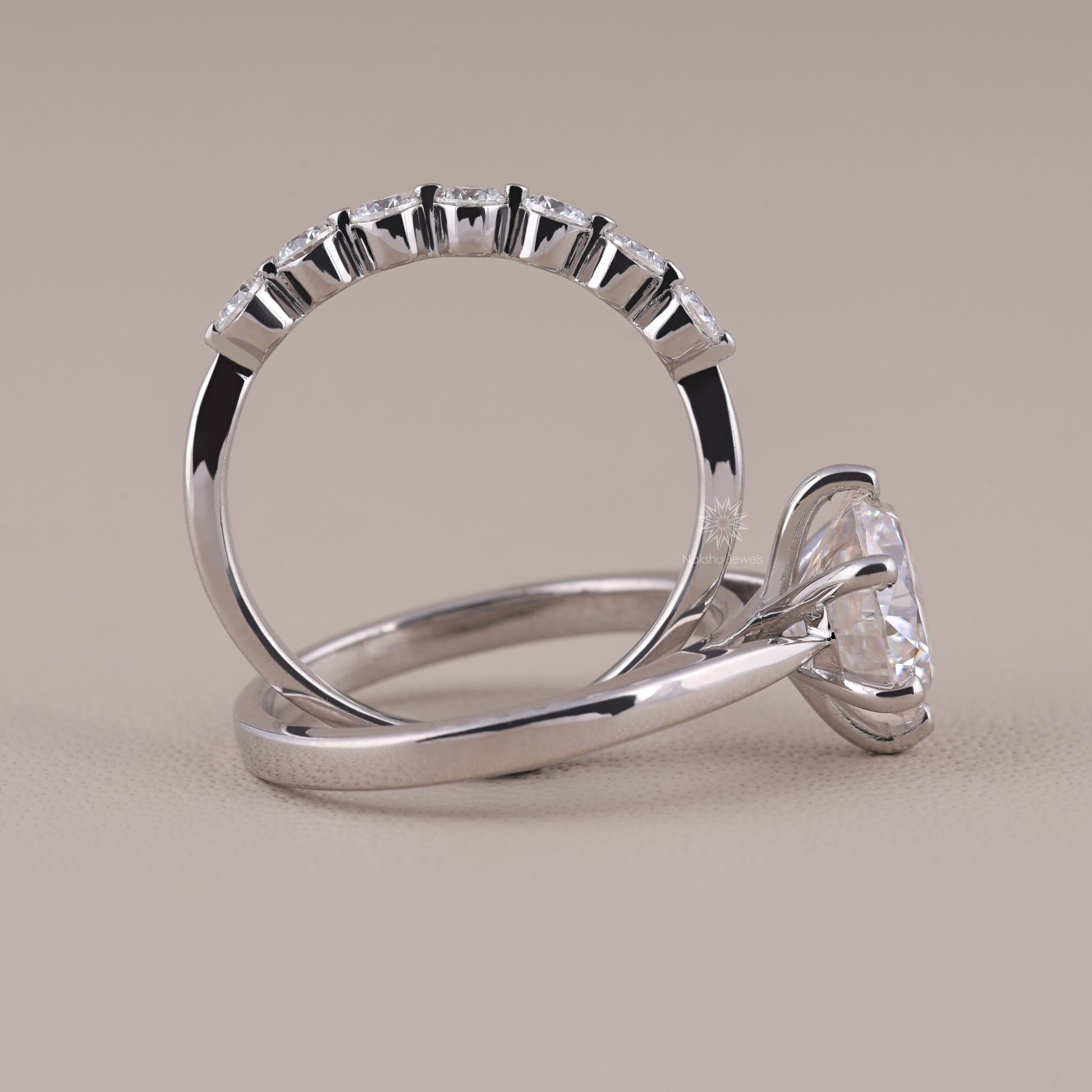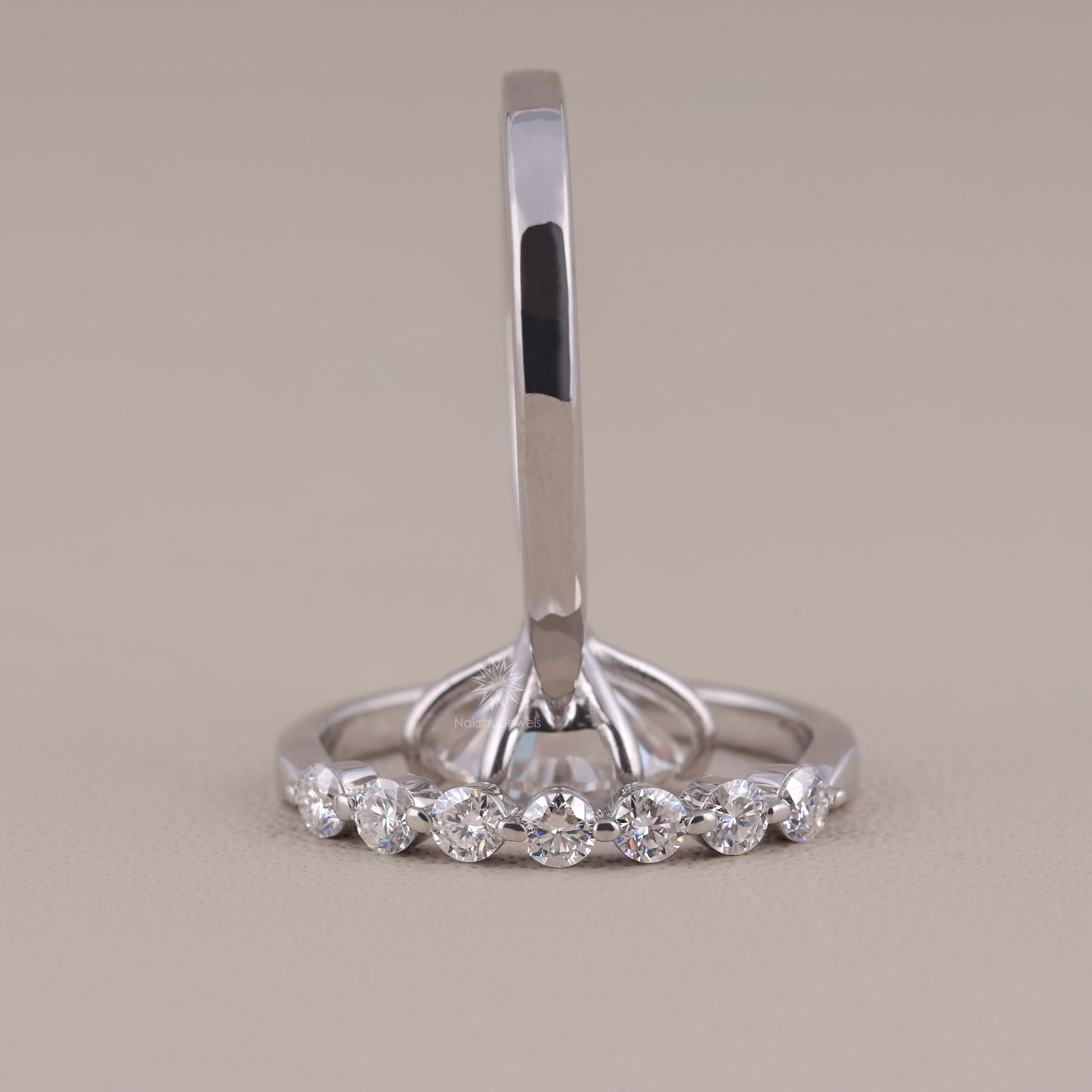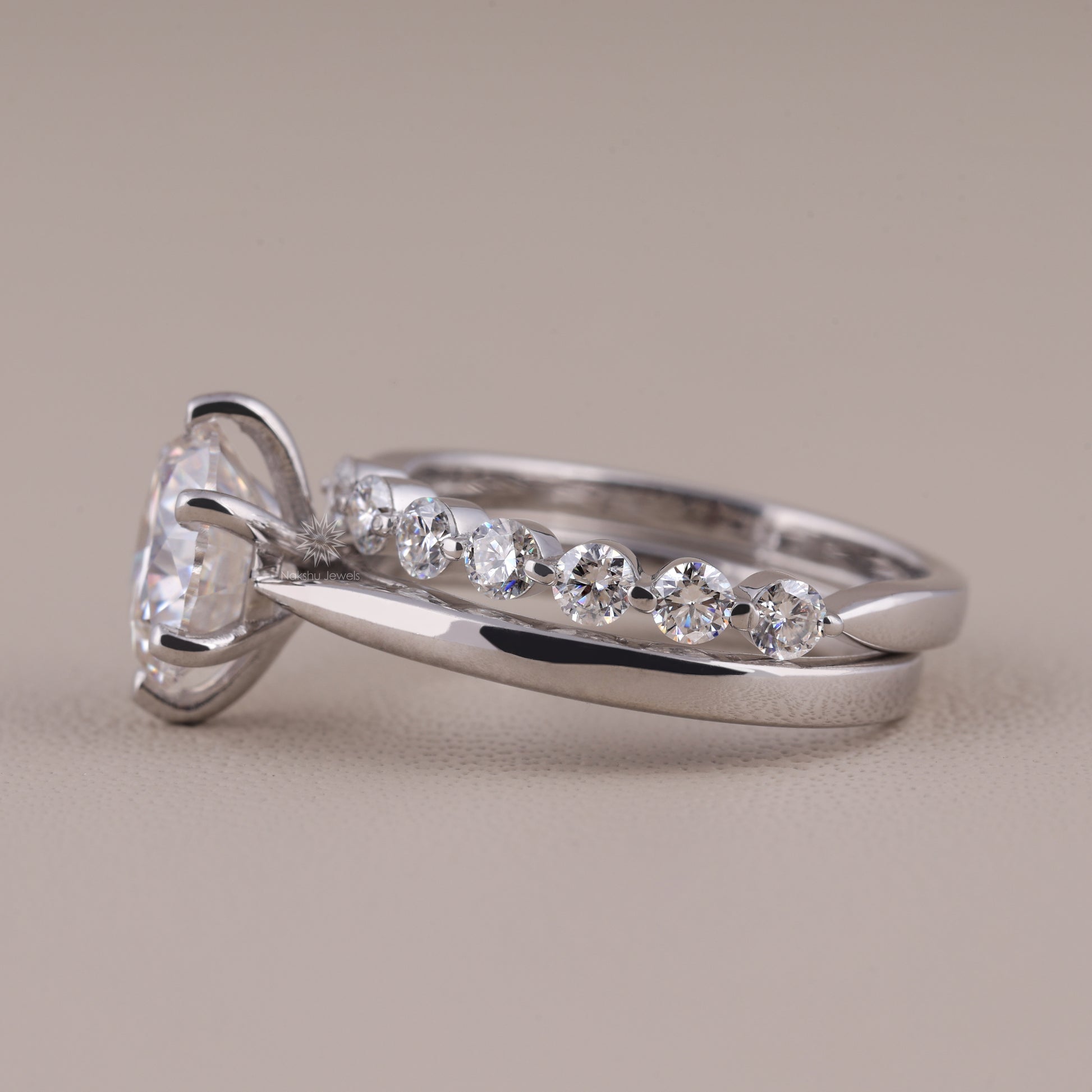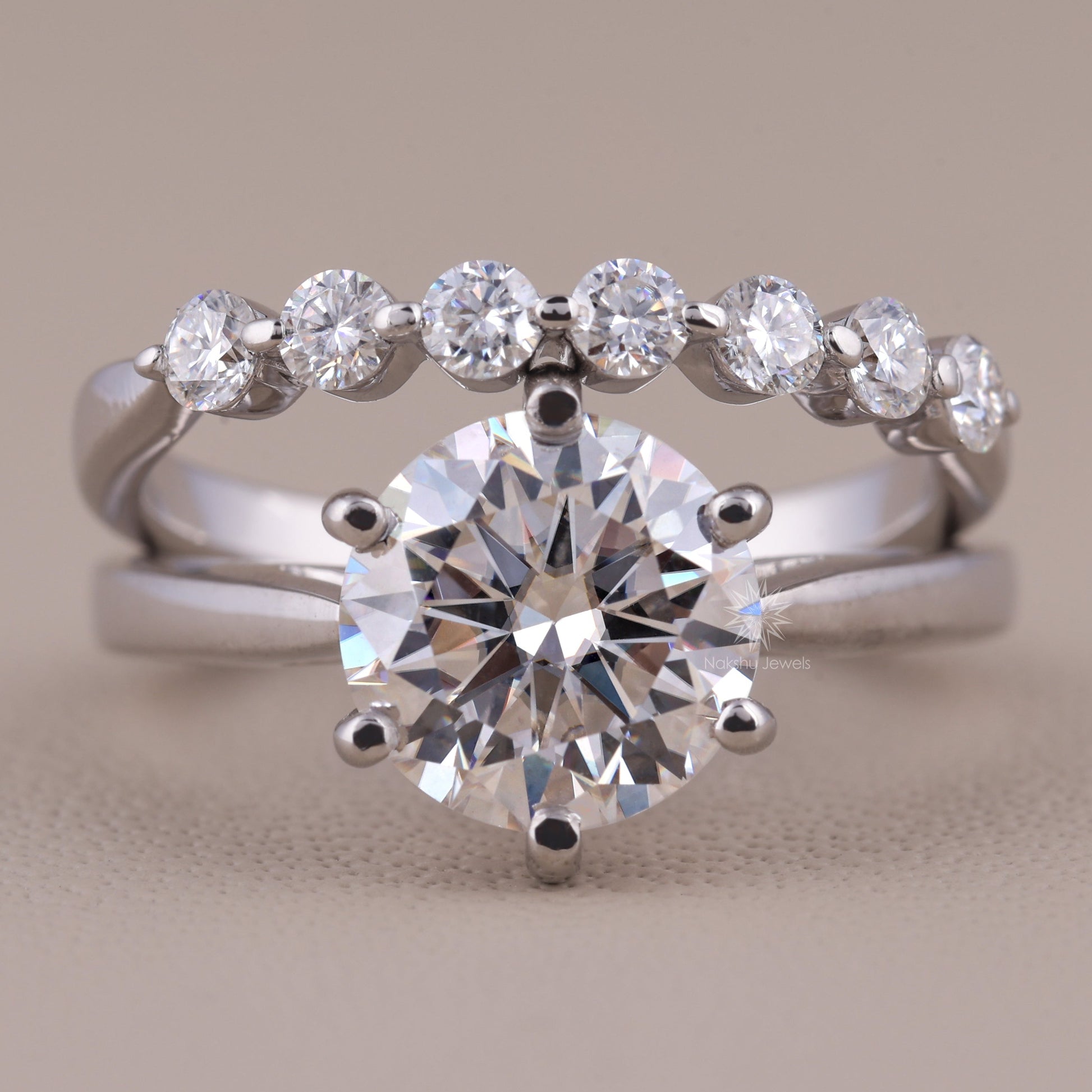 Round Brilliant Cut Solitaire Moissanite Wedding Set, with Floating Bubble Prong Half Eternity Matching Band Gift for Her